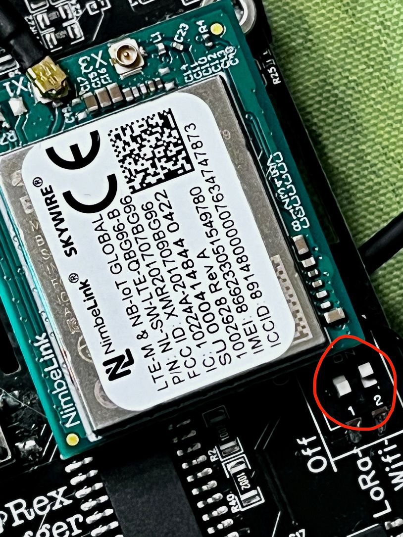 The dip switch is just below the LoRa and cell modem on the right side of the board
